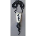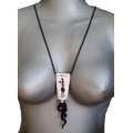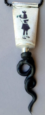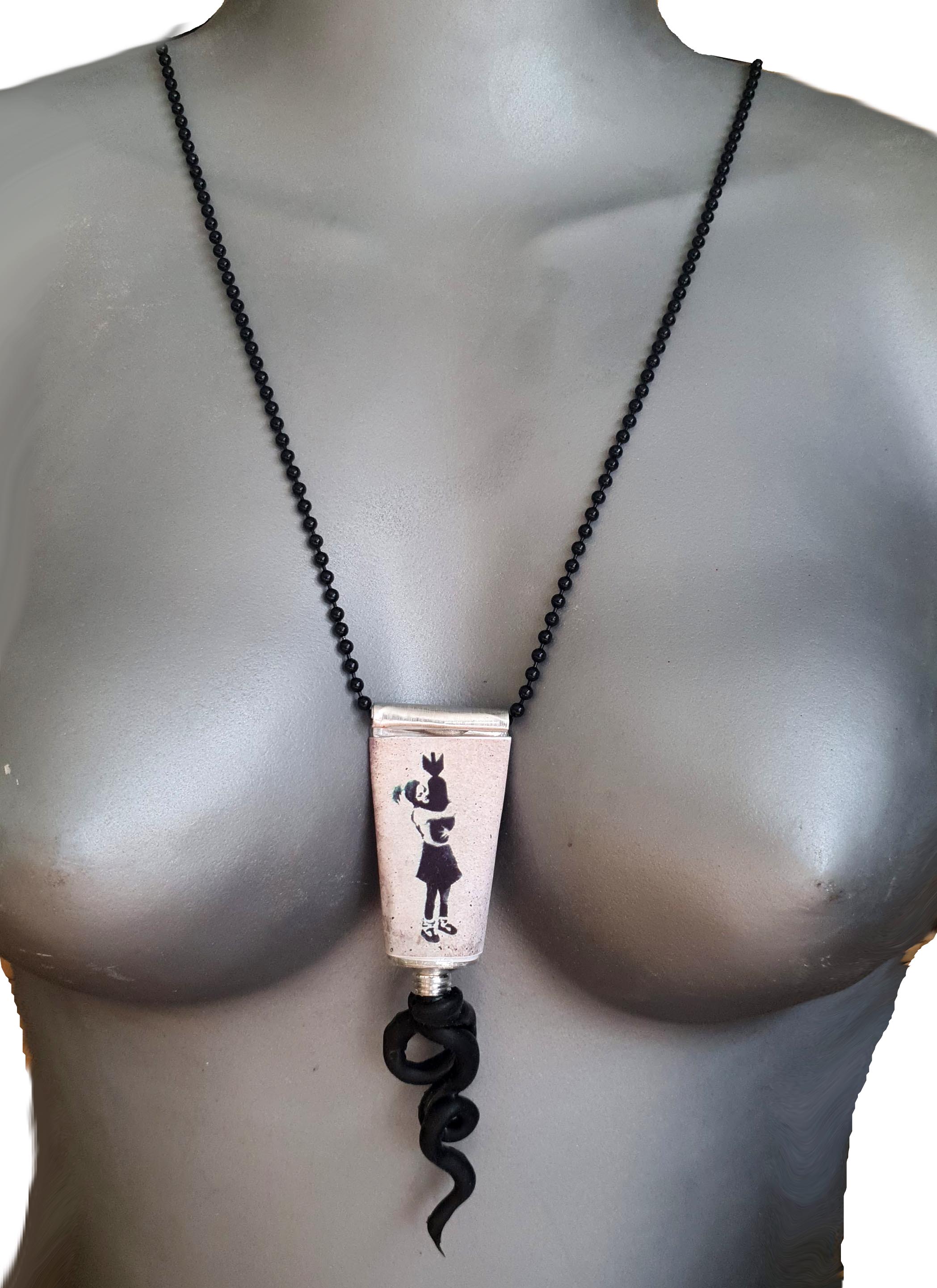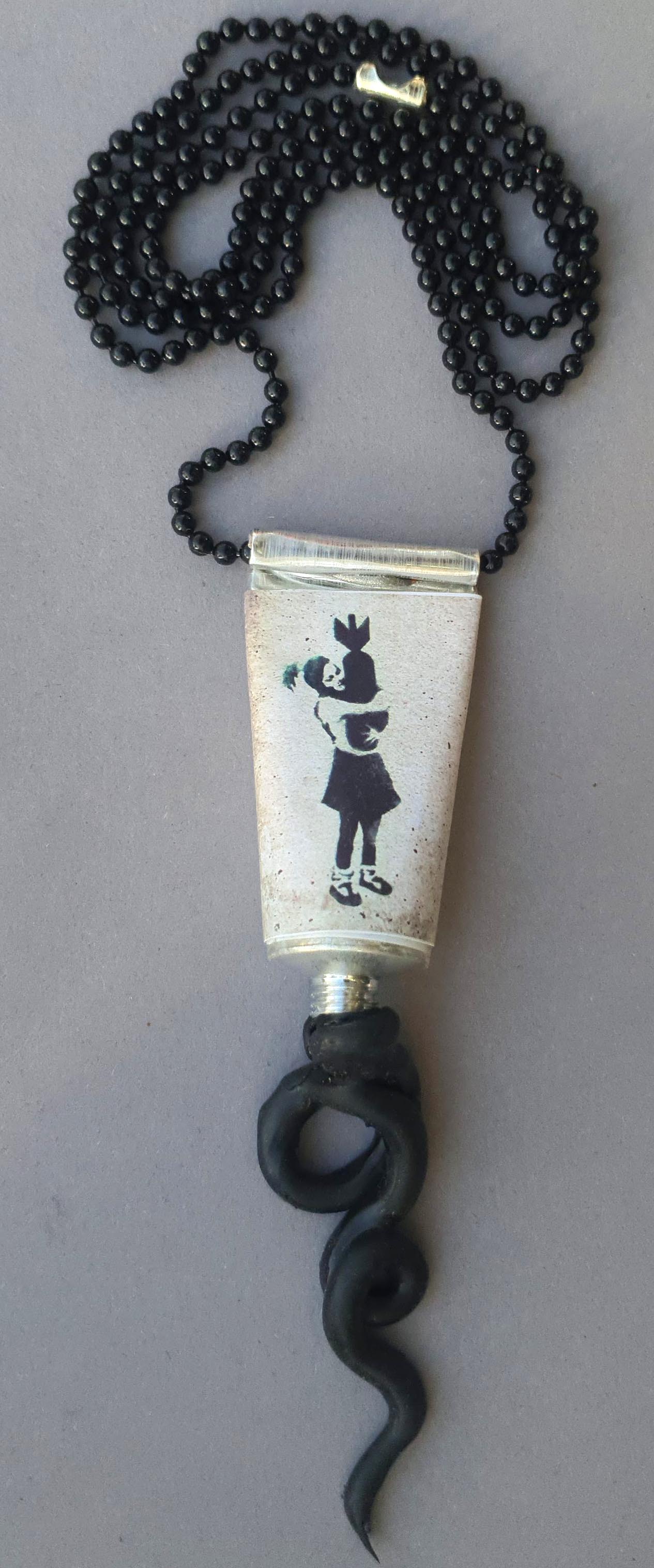 Ein zeitloser Anhänger nach einem Motiv von Banksy. Zum Medaillon " Raketenliebe" wird eine Metallkugelkette mit einer Länge von etwa 90cm geliefert, einmalig kürzbar . Der schwarze Tubenstrang besteht aus weichem Silikonkautschuk, der nicht abfärbt , das Motiv und Silikon ist in matt gehalten